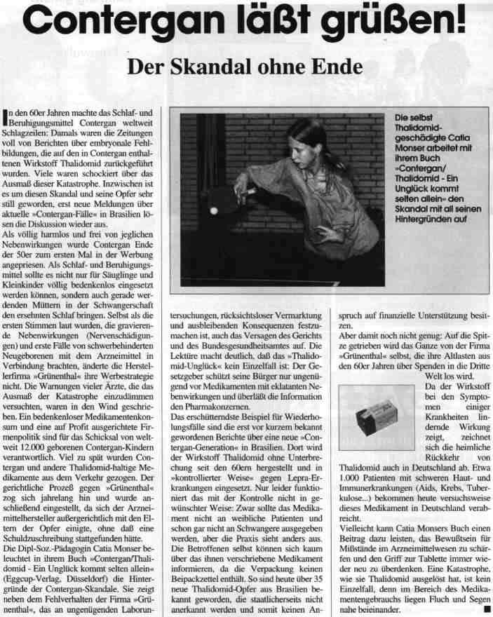 Es mußten noch einmal fast 20 Jahre vergehen, bis die Hintergründe und Folgen des Conterganskandals auch in deutschen Originalen nachgelesen werden konnten. Catia Monser hat mit ihrem im Selbstverlag erschienenen Buch vor allem zwei Dinge geleistet: Sie hat die aufklärende Arbeit von Sjöström und Nilsson aktualisiert und der Öffentlichkeit erneut zugänglich gemacht, und sie hat einen beachtlichen Pressespiegel von den anfänglichen Schlagzeilen über Monsterbabies bis zu den ersten Meldungen über "tüchtige" Conterganmütter zusammengestellt. Ihre ausführliche Aufklärungsarbeit beschränkt sich nicht auf die Darstellung des Verhaltens der Täterfirma Grünenthal damals und heute, auch die zwielichtigen Entwicklungen innerhalb des von Eltern gegründeten und nun von Behinderten selbst geführten Conterganverbandes nimmt sie ins Visier. Der Frage, warum der Verband so schnell seinen Frieden mit Grünenthal schloß, beantwortet die Autorin und langjährige Mitarbeiterin des Verbandes mit interessantem Insiderwissen.