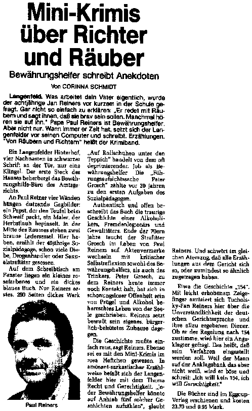 Reiners Geschichten sind nicht voyeuristisch oder mit dem moralischen Zeigefinger ausformuliert, sondern sie sind witzig mit einem Schuß Satire zu Papier gebracht. Seine jahrelange Erfahrung im Umgang mit Menschen wird in jedem Absatz spürbar. Der Autor versteht es, seine Protagonisten gefühlvoll und menschlich zu schildern und bei den LeserInnen Sympathie für diese zu wecken, ohne selbst Partei zu ergreifen. Kurz gesagt: Der Autor zeichnet sich mit der nötigen Distanz eines guten Erzählers aus. Reiners versteht es von Anfang an spannend zu schildern, die Spannung zu steigern und am Ende durch einen für die LeserInnen oft unerwarteten Schluß einen Spannungseffekt draufzusetzen. Für den/die BetrachterIn bleiben die Fälle »ungelöst«, aber das liegt in der Natur der Sache. Und so läßt das Ende jedes Kurzkrimis viel Raum zum Weiterspinnen der Geschichte. Ein Büchlein, welches leicht in jede Jackentasche paßt, und für LeserInnen, die sich diverse Wartezeiten mit guter Literatur verkürzen wollen.